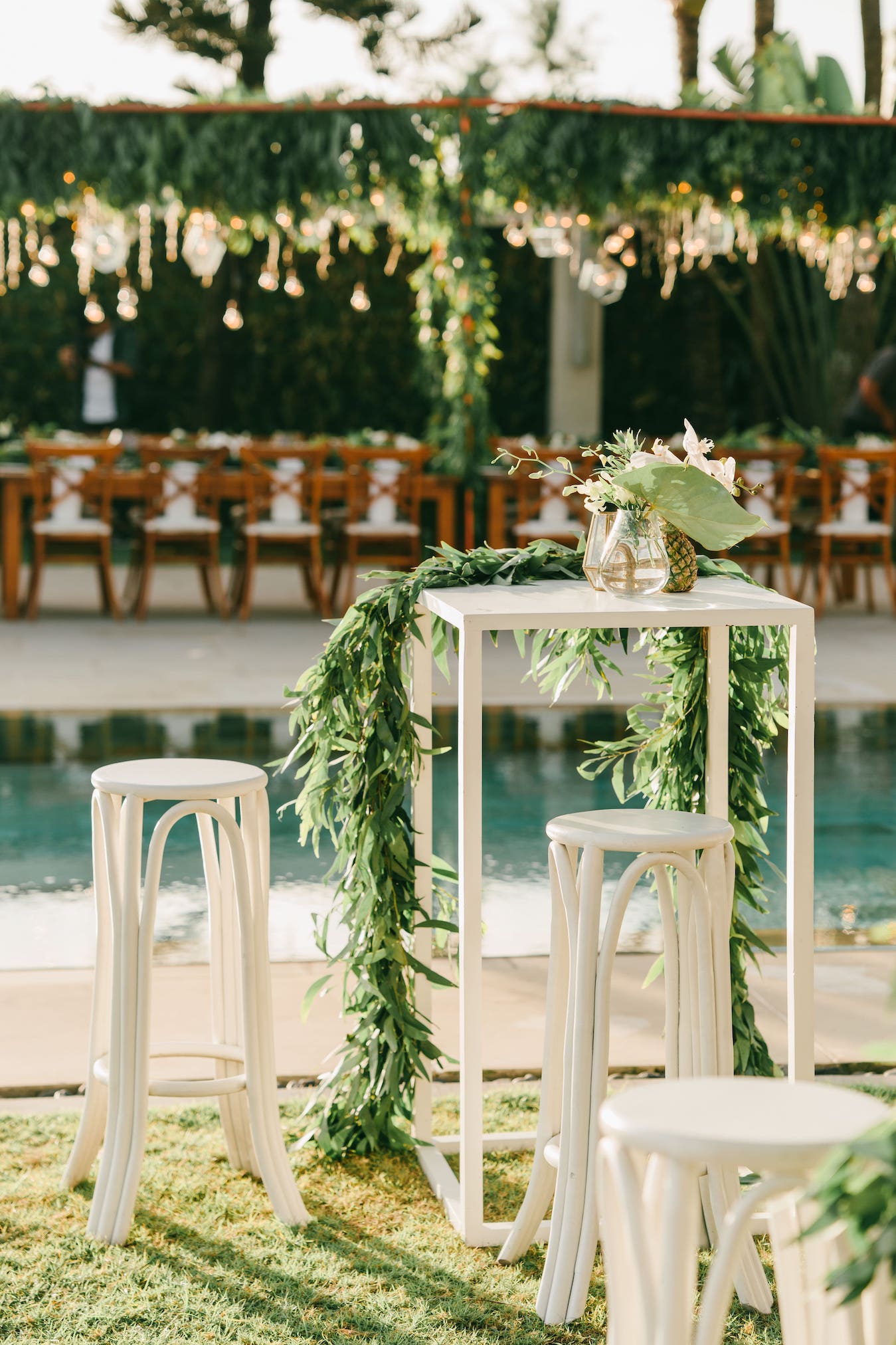 This couple chose our beautiful teak furniture, chairs and tables to add to their stunning tropical theme for their reception and cocktails were enjoyed on our Amalfi Hi Sets strategically placed around the grounds of Villa Vedas so everyone could catch the sunset.
