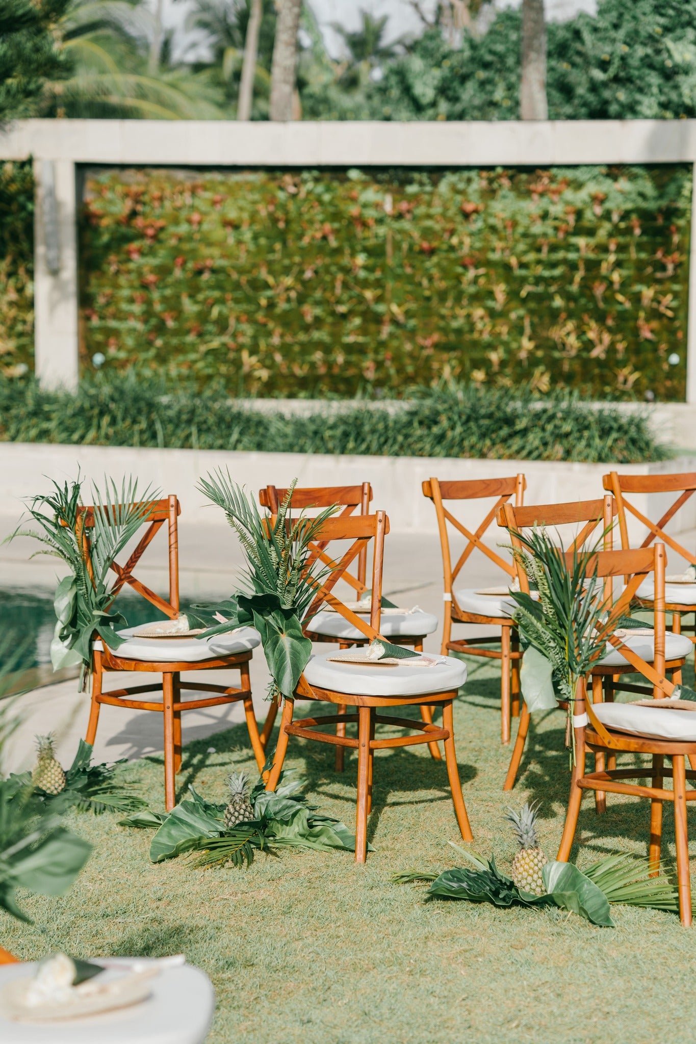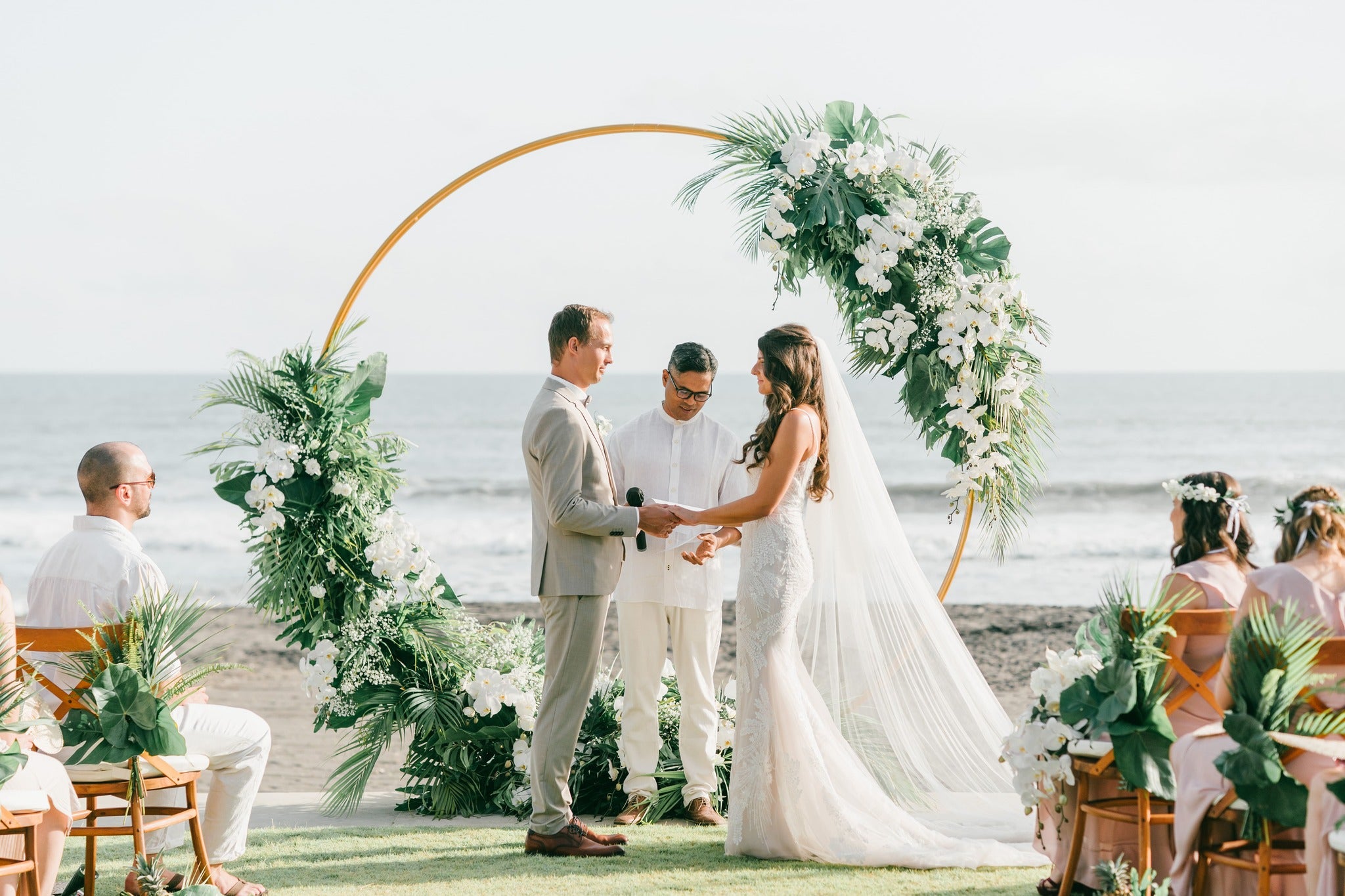 There was an intimate beachfront ceremony with a ring adorned with the most beautiful greenery not to be outdone by the even more stunning reception with scenic views & orchid theme with pineapple touch flowers and luxury furniture from us, Bali Event Hire.
